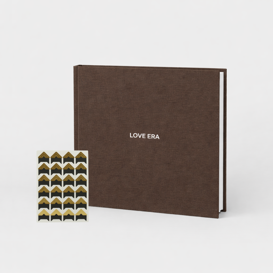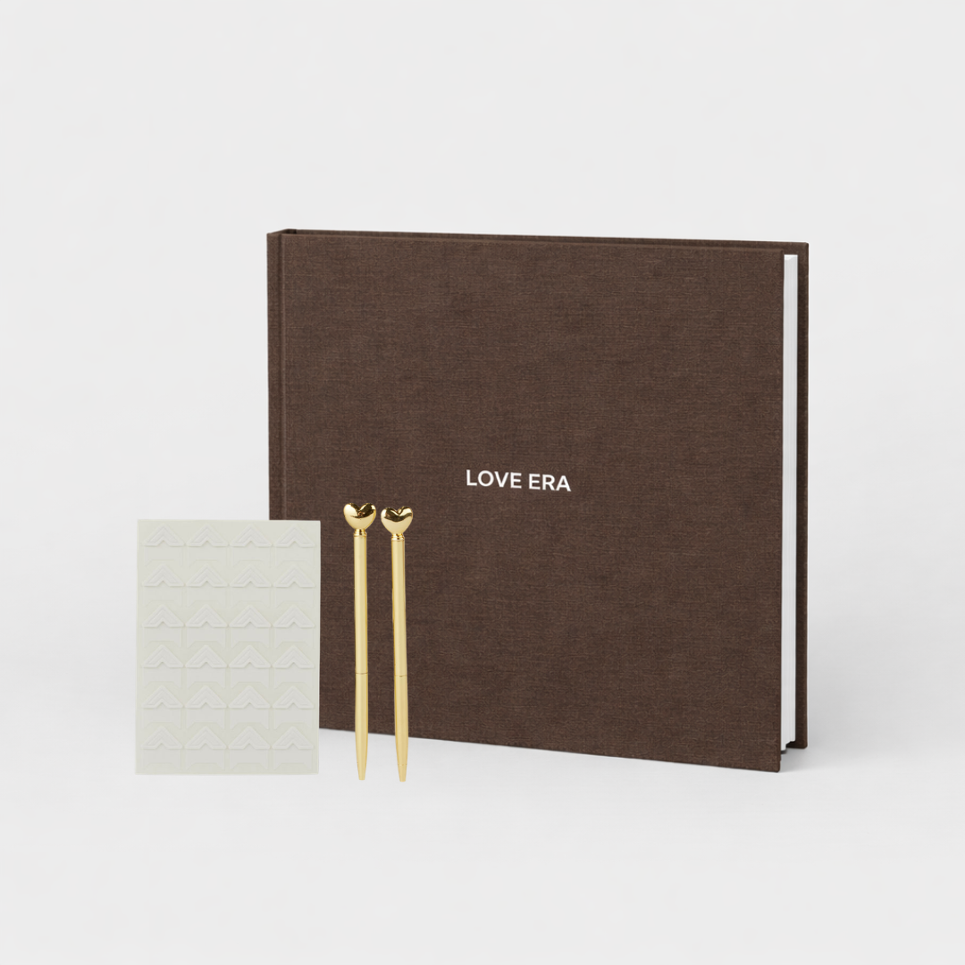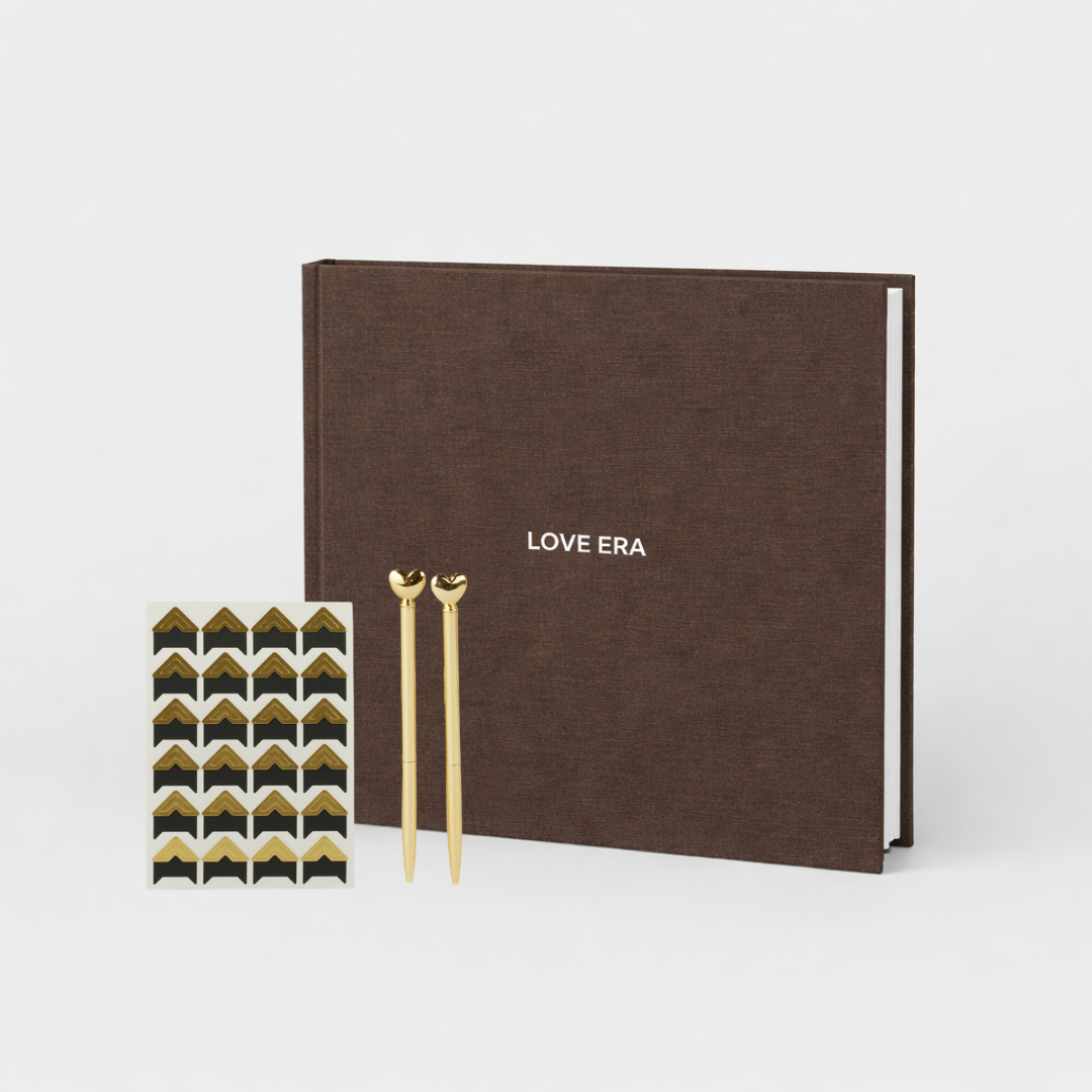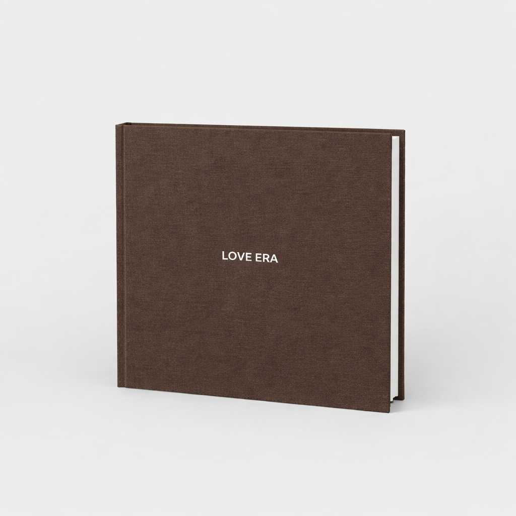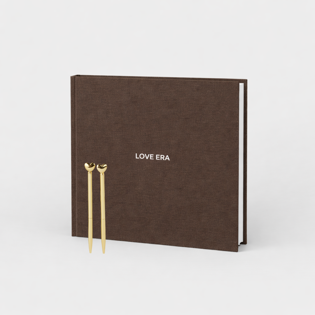 Our Linen Guest Book features a chocolate brown linen cover with a subtle textured finish, embossed with Love Era in White.