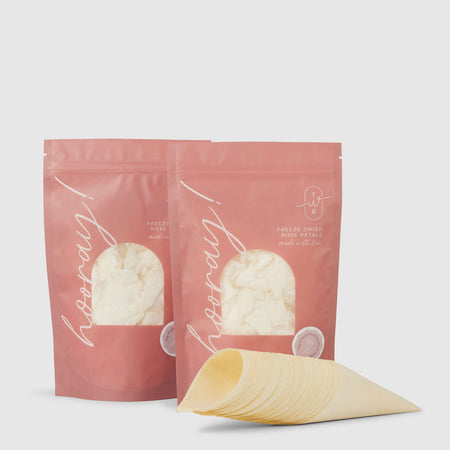 Make your confetti moment effortless with our Rose Petal Bundle – complete with freeze-dried rose petals and perfectly matched cones, ready to go.