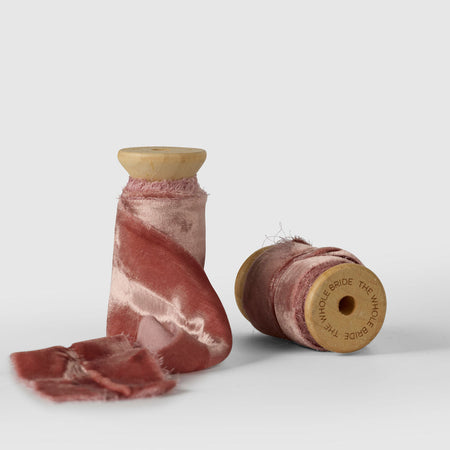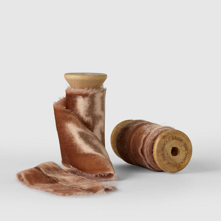 Crafted from velvet with a gentle silk-like sheen, each ribbon drapes beautifully and is hand-dyed in small batches. Available in 9 stunning shades to complement any wedding palette—from soft neutrals to rich, moody tones.