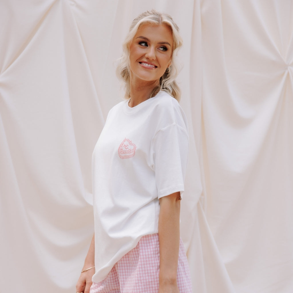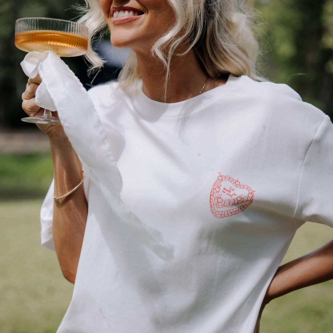 This oversized tee is made from super soft 100% cotton with a creamy warm base and a pop of red artwork that gives major cute-core vibes. The back's all party – with bows, bubbly, and disco balls. While the front keeps it chill with a 'til death slice of cake.